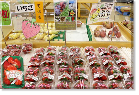■せんぷくイチゴ JA仙台の農産物直売所「たなばたけ」で販売の様子 |