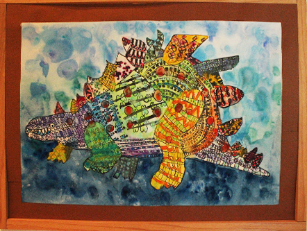 講評 ステゴザウルスの形もよく描かれており、その形の中に模様のように形と色で充実した魅力。 |