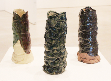 講評 手捻りでとても丁寧に作られています。釉薬の調子も美しく、3つの作品のバランスが素晴らしいと思います 。 |